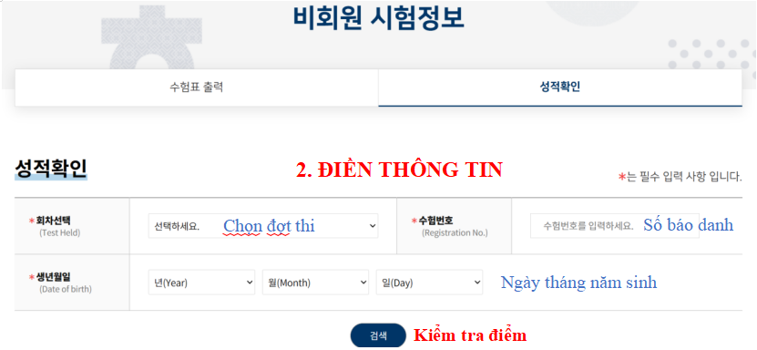 Tiếp đó nhấn “검색” (kiểm tra) để hệ thống hiện ra kết quả thi của bạn.
