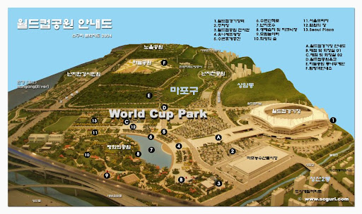 Ngay bên cạnh sân vận động chính là vị trí của đảo Nanjido, hay ngày nay được gọi bằng cái tên dễ nhớ hơn là công viên World Cup. Công viên World Cup cũng được xây dựng để kỷ niệm Vòng chung kết bóng đá World Cup FIFA Hàn Quốc – Nhật Bản. Công viên được bắt đầu khởi công tái tạo và xây dựng từ tháng 10 năm 1999 và hoàn thành vào ngày 1 tháng 5 năm 2002. Công viên Pyeonghoa (Hòa bình), công viên Haneul (Bầu trời), công viên Noeul (Hoàng hôn), công viên Nanjicheon (Thiên Lan Chi), Công viên Nanjihangang (sông Hán Lan Chi) là tổ hợp 5 công viên nằm trong công viên World Cup.